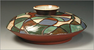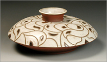 in red clay with line design (above) and red clay with white paisley (right).