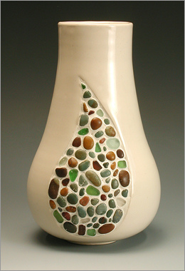 Fired to cone 6 in oxidation. Beach stones and glass attached after firing.