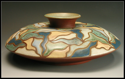 Wheel thrown and assembled from 3 pieces Decorated using wax resist technique Fired to cone 6 in oxidation 13" diameter