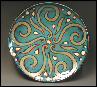 Wheel thrown and decorated using wax resist technique Fired to cone 6 in oxidation 12" diameter