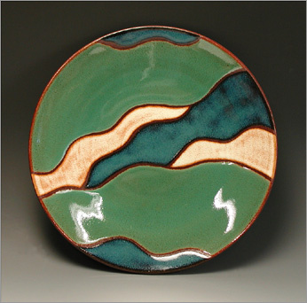 Wheel thrown and decorated using wax resist technique Fired to cone 6 in oxidation 12" diameter